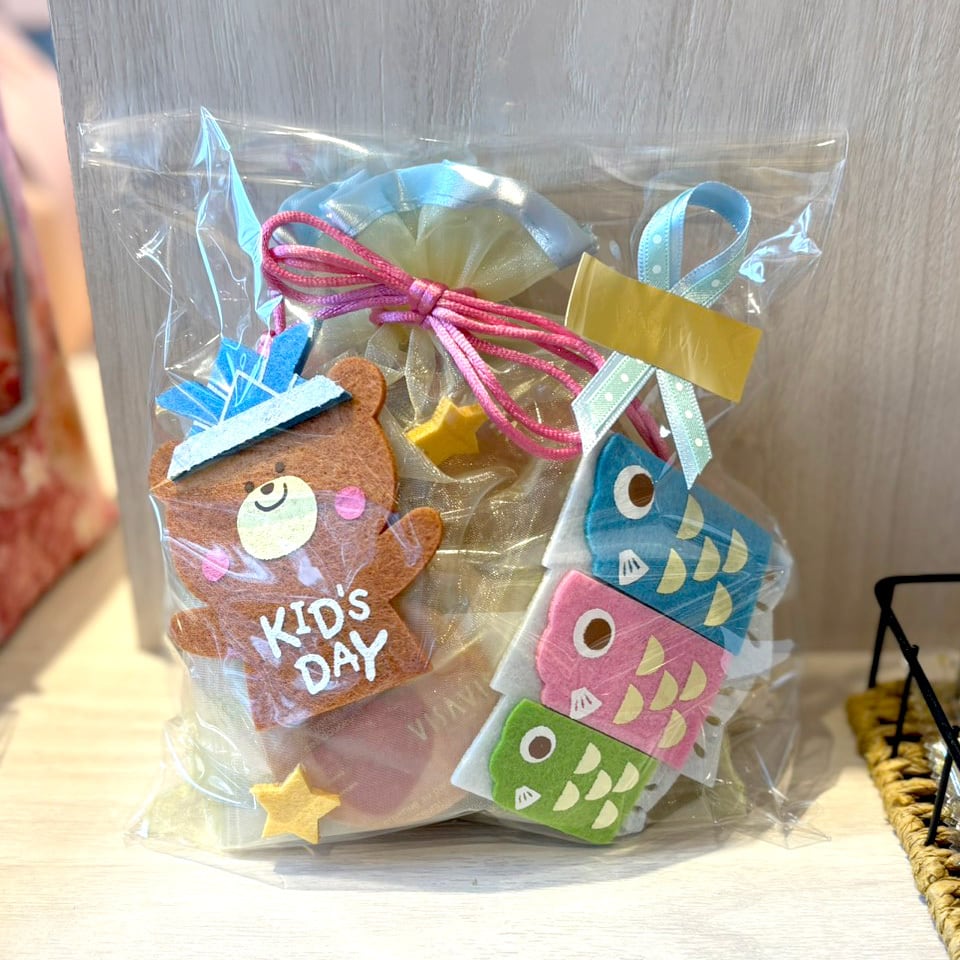 やわらかな巾着ポーチの中には、色とりどりのこいのぼりモチーフと、子どもの日を楽しく演出するパーツをセット。見た目にも華やかで、贈り物にもぴったりの仕上がりです。